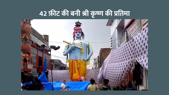 मथुरा से आये मुस्लिम कारीगर स्वराज अहमद ने बताया की यह उनका खानदानी पेशा है और चालीस दिन की कड़ी मेहनत के बाद उन्होंने इस 42 फुट की प्रतिमा का निर्माण किया है। कारीगर स्वराज ने दावा किया की आज तक उन्होंने श्री कृष्ण की इतनी बड़ी प्रतिमा कभी नहीं बनायी। यह अपने आप में पहली विशाल प्रतिमा है जिसमे एक मोटर लगाई गयी है और इस मोटर की वजह से मूर्ति का मुख दाई-बाई और घूमता है।