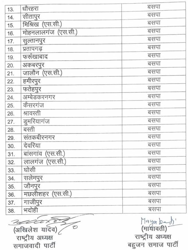 आगामी चुनाव में सपा 37 और बसपा 38 सीटों पर चुनाव लड़ेगी। सपा-बसपा गठबंधन ने कांग्रेस के लिए अमेठी और रायबरेली की दो सीटें छोड़ी हैं। राष्ट्रीय लोकदल (आरएलडी) को तीन सीटें दी गई हैं। आरएलडी के खाते में उसकी परंपरागत मथुरा, बागपत और मुजफ्फरनगर सीटें आईं हैं। पश्चिमी उत्तर प्रदेश की ज्यादातर सीटें एसपी तो पूर्वी यूपी की ज्यादातर सीटें बसपा के खाते में आईं हैं।