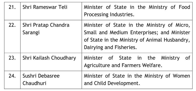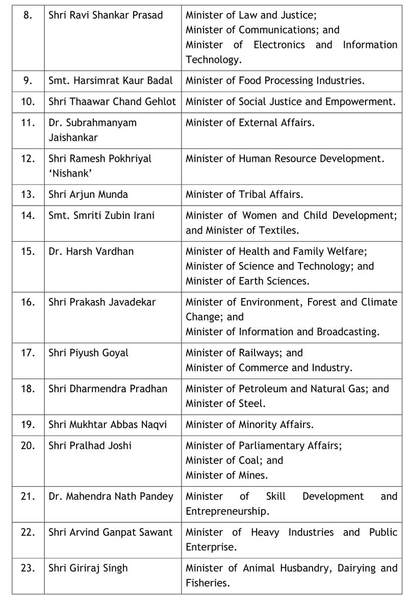 रमेश पोखरियाल निशंक को केंद्रीय मानव संसाधन मंत्री बनाया गया है। अर्जुन मुंडा को जनजाति विभाग सौंपा गया है। धर्मेंद्र प्रधान को पेट्रोलियम मंत्री बनाया गया है। मुख्तार अब्बास नकवी को अल्पसंख्यक मामलों का मंत्री बनाया गया है। प्रहलाद जोशी को संसदीय कार्यमंत्री बनाया गया है। महेंद्र नाथ पांडेय को स्किल डेवलेपमेंट मंत्री बनाया गया है।