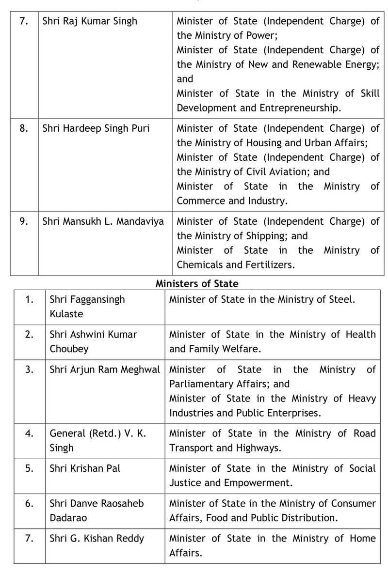 मुख्तार अब्बास नकवी को अल्पसंख्यक मामलों के मंत्रालय की जिम्मेदारी सौंपी गई है। संतोष कुमार गंगवार श्रम एवं रोजगार राज्य मंत्री स्वतंत्र प्रभार, राव इंद्रजीत सिंह सांख्यिकी एवं कार्यक्रम अनुपालन राज्य मंत्री स्वतंत्र प्रभार, श्रीपद यशो नाइक को आयुर्वेद, योग एवं रक्षा राज्य मंत्री स्वतंत्र प्रभार, जितेंद्र सिंह को प्रधानमंत्री कार्यालय में राज्य मंत्री स्वतंत्र प्रभार, किरण रिजिजू को युवा एवं खेल मामलों के मंत्री का स्वतंत्र प्रभार, प्रह्लाद पटेल को संस्कृति एवं पर्यटन राज्य मंत्री स्वतंत्र प्रभार, आर के सिंह ऊर्जा राज्य मंत्री स्वतंत्र प्रभार, हरदीप सिंह पुरी को आवास एवं शहरी मामलों के राज्य मंत्री का स्वतंत्र प्रभार तथा मनसुख मंडाविया को पोत परिवहन तथा रसायन एवं उर्वरक राज्य मंत्री का स्वतंत्र प्रभार दिया गया है।