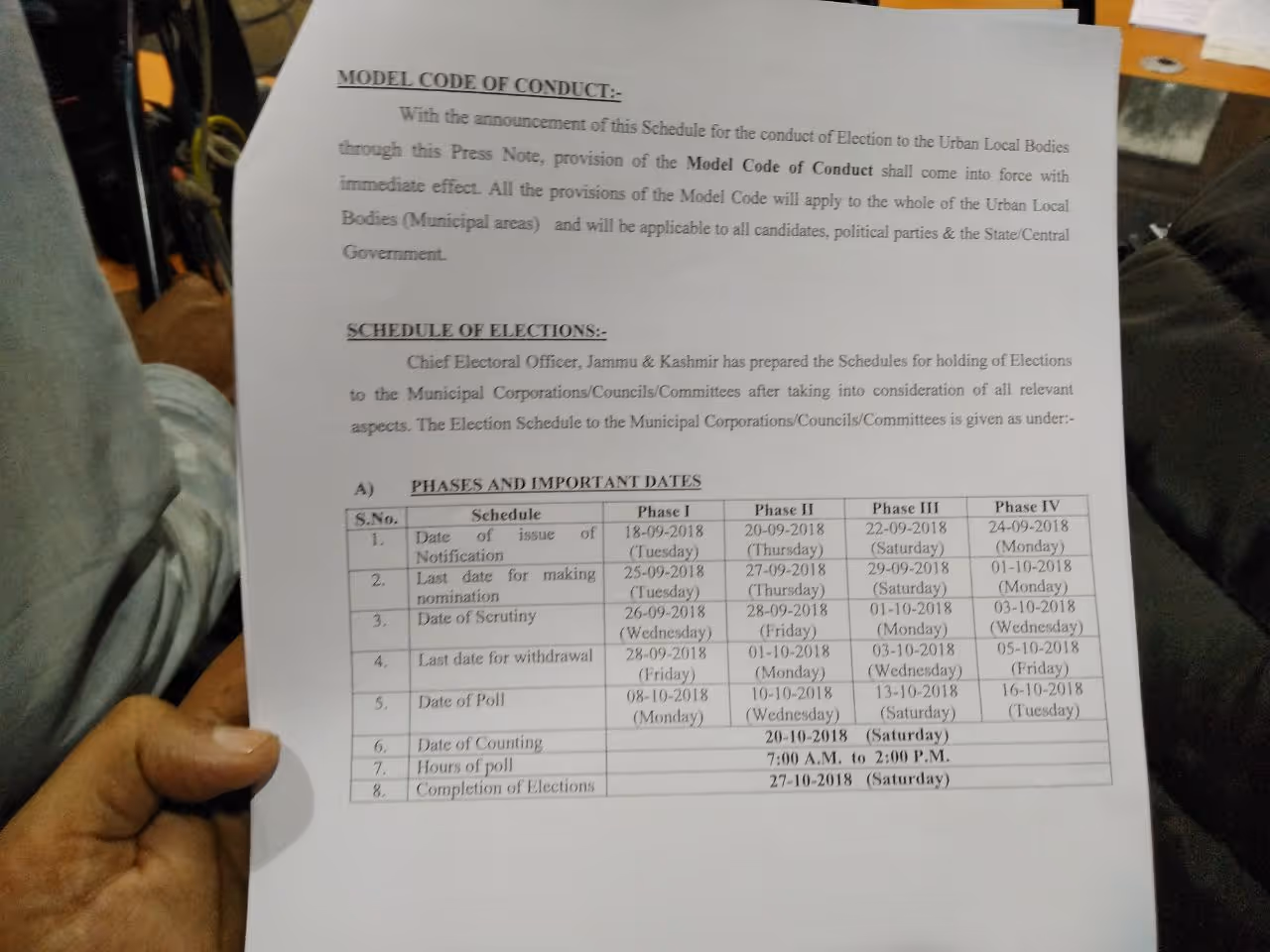 जम्मू-कश्मीर के प्रमुख दल नेशनल कांफ्रेंस (नेकां) और पीडीपी के बॉयकॉट के बावजूद राज्य में निकाय चुनाव की तारीखों का ऐलान कर दिया गया है। श्रीनगर में चीफ इलेक्टोरल ऑफिसर शालीन काबरा ने कहा कि निकाय चुनाव चार चरण में होंगे। 4 चरणों के चुनाव 8, 10, 13 और 16 अक्टूबर को होंगे जबकि चुनाव की मतगणना 20 अक्टूबर को होगी ।