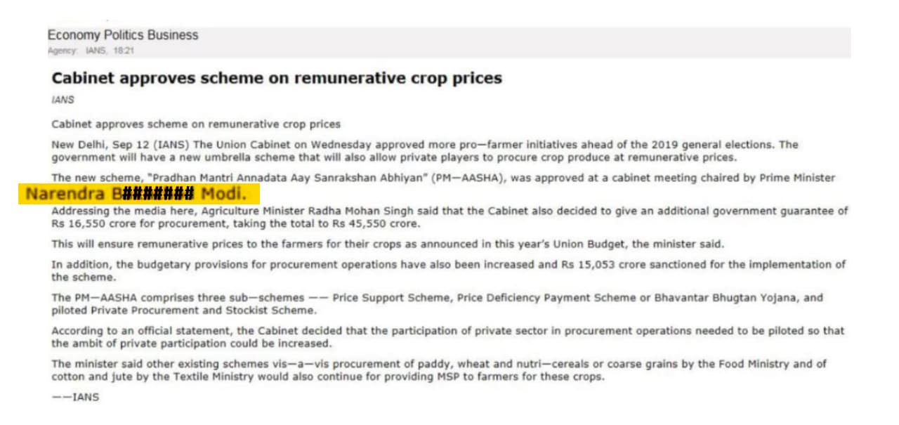 हम इस खबर के साथ वह विवादास्पद आलेख की प्रति भी दिखा रहे हैं, यह अंग्रेजी में है, जिसमें लिखा है, “The new scheme, “Pradhan Mantri Annadata Aay Sanrakshan Abhiyan” (PM-AASHA), was approved at a cabinet meeting chaired by Prime Minister Narendra ******** Modi.”