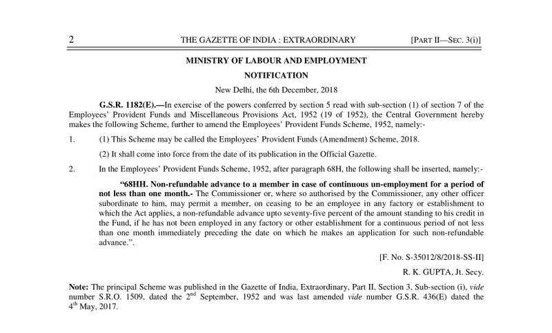 श्रम एवं रोजगार मंत्रालय की अधिसूचना के अनुसार, कोई भी नौकरीपेशा व्यक्ति जिसकी नौकरी छूट जाती है या वह नौकरी छोड़ देता है और एक महीने से ज्यादा समय तक बेरोजगार रहता है तो वह अपने पीएफ खाते से अधिकतम 75 प्रतिशत रकम निकाल सकता है। नियम के अनुसार, पीएफ खाते से निकाली गई रकम उसे वापस नहीं करनी पड़ेगी। पहले ईपीएफ योजना 1952 के तहत बेरोजगारी की स्थिति में आंशिक निकासी की सुविधा नहीं थी। नौकरी छोड़ने के बाद व्यक्ति सिर्फ अंतिम निपटारा ही कर सकता था।