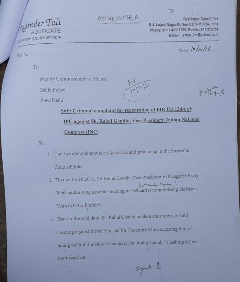 तुली का आरोप है कि राहुल गांधी ने साल 2016 में आयोजित किसान यात्रा के दौरान आपत्तिजनक बयान दिया था, जो कि देशद्रोह की श्रेणी में आता है।
