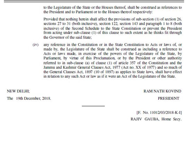 जम्मू-कश्मीर में भाजपा के 19 जून को पीडीपी से समर्थन वापस लेने के बाद से राज्य में लगा राज्यपाल शासन बुधवार को खत्म हो गया। जम्मू- कश्मीर के राज्यपाल सत्यपाल मलिक की राज्य में राष्ट्रपति शासन लगाने की सिफारिश को राष्ट्रपति रामनाथ कोविंद ने हरी झंडी दे दी।