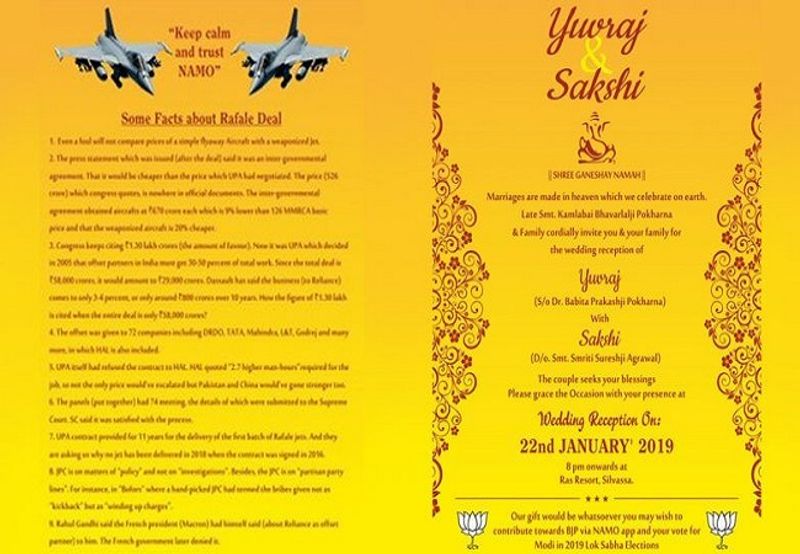 कार्ड पर लिखा है कि कांग्रेस अध्यक्ष सुप्रीम कोर्ट के संतुष्ट होने के बाद भी आरोप लगा रहे हैं, जबकि यूपीए सरकार ने इस सौदे को 11 साल तक लटकाए रखा। वहीं मोदी ने आते ही इसे हरी झंडी दे दी। शादी के कार्ड पर यह अपील भी की गई है कि उन्हें कोई तोहफा नहीं चाहिए, अगर कोई विवाह में कुछ देना चाहता है तो वह 2019 के लोकसभा चुनाव में नरेंद्र मोदी को वोट दे।