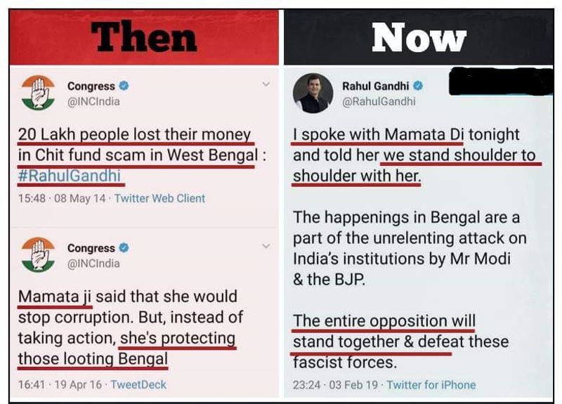 लेकिन राहुल गांधी कभी इस मुद्दे पर राज्य की ममता सरकार को सीधे तौर पर कठघरे में खड़ा करते थे और अब भ्रष्टाचार के समर्थन दे रहे हैं। राहुल गांधी ने कुछ समय पहले अपने भाषण मे कहा कि “ममता जी कहती हैं कि वह भ्रष्टाचार को बंगाल से मिटा देंगी, लेकिन अब उन्हें भ्रष्टाचार नहीं दिखाई देता है। उनके सामने उनके लोगों ने चोर की तो उन लोगों के खिलाफ उन्होंने कोई एक्शन नहीं लिया बल्कि उनकी रक्षा की”। राहुल गांधी राज्य में विधानसभा चुनाव और लोकसभा चुनाव में ममता बनर्जी सरकार को भ्रष्टाचार पर घेरते आए हैं और उन्हीं के भ्रष्टाचार को संरक्षण दे रहे हैं।