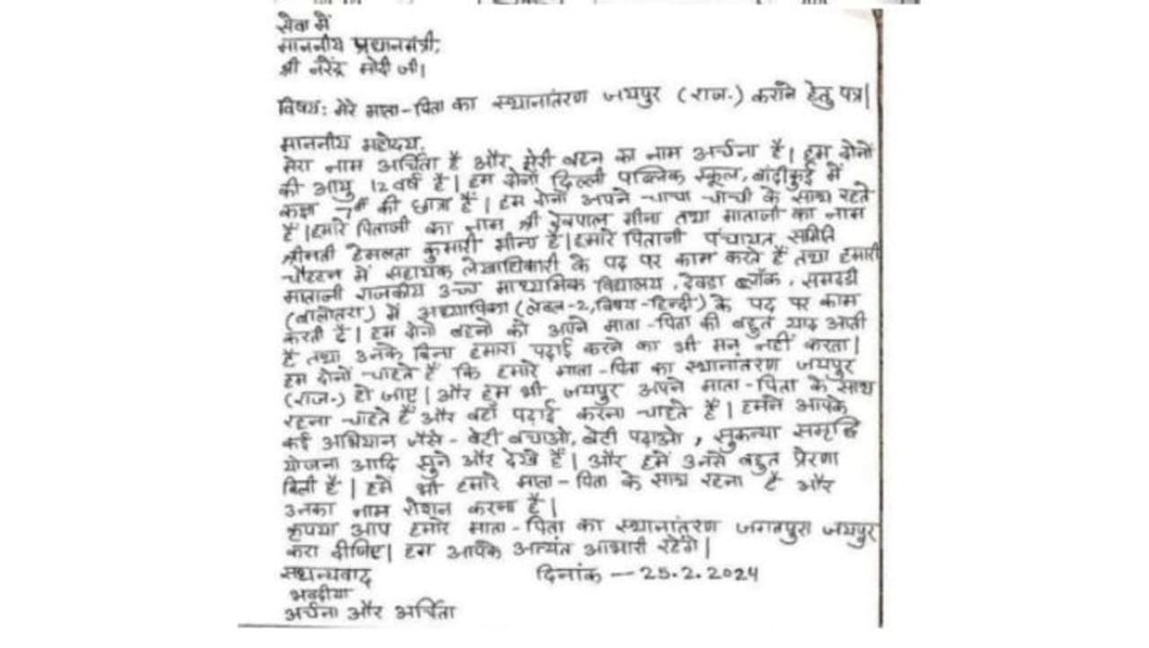 इन दोनों बहनों ने पीएम नरेंद्र मोदी को पत्र लिखा है। जिसमें उन दोनो ने लिखा है कि वह अपने माता-पिता के साथ रहना चाहती हैं। फिलवक्त वह दोनों अपने चाचा चाची के साथ उनके घर में रह रही हैं। हम दोनो बांदीकुई में पढ़ते है। अगर प्रधानमंत्री मोदी चाहे तो वह अपने माता-पिता के साथ दौसा या जयपुर जिले में रह सकती है। इन दोनों बहनों ने पीएम मोदी के नाम पत्र में इमोशनल लाइन भी लिखी है। उनका कहना है कि अगर आप चाहे तो हम दोनों बहनों के माता-पिता का तबादला जयपुर हो सकता है। पिता का नाम देवपाल मीना और मा का नाम हेमलता मीना है। इन दोनों बहनों का नाम अर्चिता और अर्चना है ।