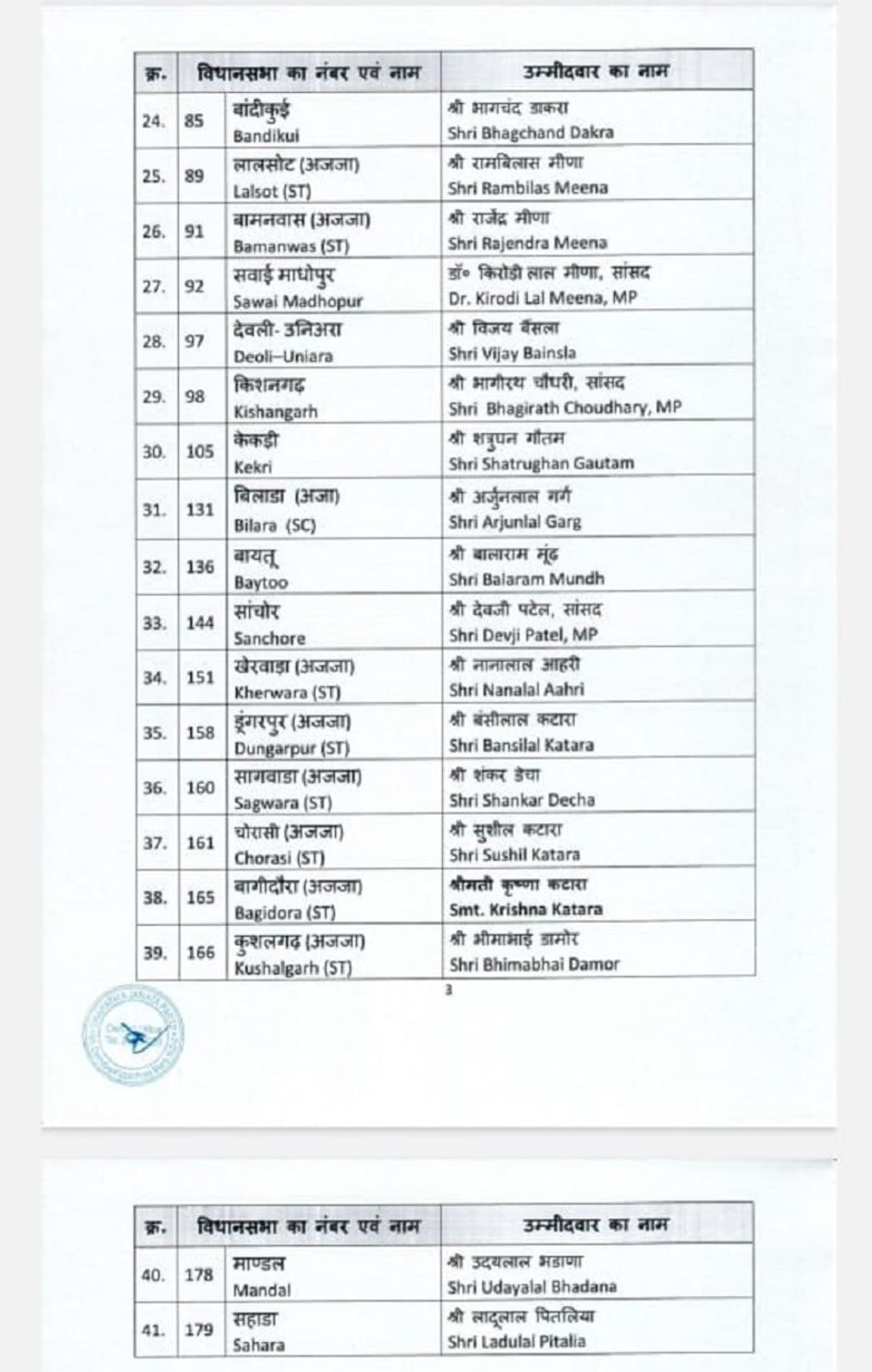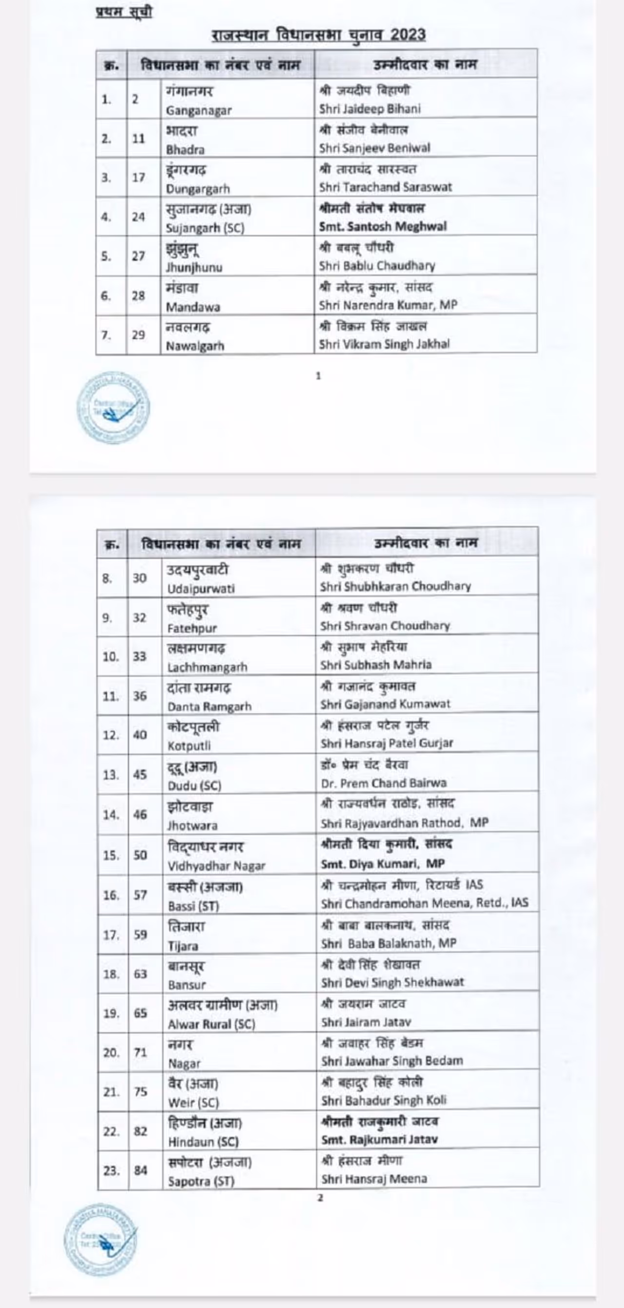 यहां देखें Rajasthan Chunav 2023 BJP Candidates List