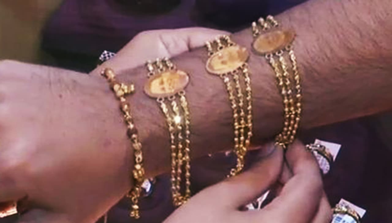 रक्षा बंधन के मौके पर तरह-तरह की राखियां बिकना कोई नई बात नहीं है। लेकिन इन दिनों गुजरात के शहर सूरत में एक नया शौक लोगों के सिर चढ़कर बोल रहा है। सोने की राखियों का। अब आप कहेंगे कि इसमें कौन सी नई बात है। कई बहनें अपने भाइयों को कलाई पर सोने की राखियां बांधती हैं। तो यहां जान लें कि ये कोई आम राखियां नहीं हैं। ये नेताओं के चेहरे वाली राखियां हैं। इन्हें 22 कैरेट सोने पर ढाला गया है। महिलाओं में इन खरीदने की होड़ मची हुई है। सबसे ज्यादा मांग प्रधानमंत्री नरेंद्र मोदी के चेहरे वाली राखी की है। उनके चेहरे वाली एक राखी की कीमत 50,000 रुपये है। इसके बावजूद लोग राखी खरीदने को बेचैन नजर आ रहे हैं।