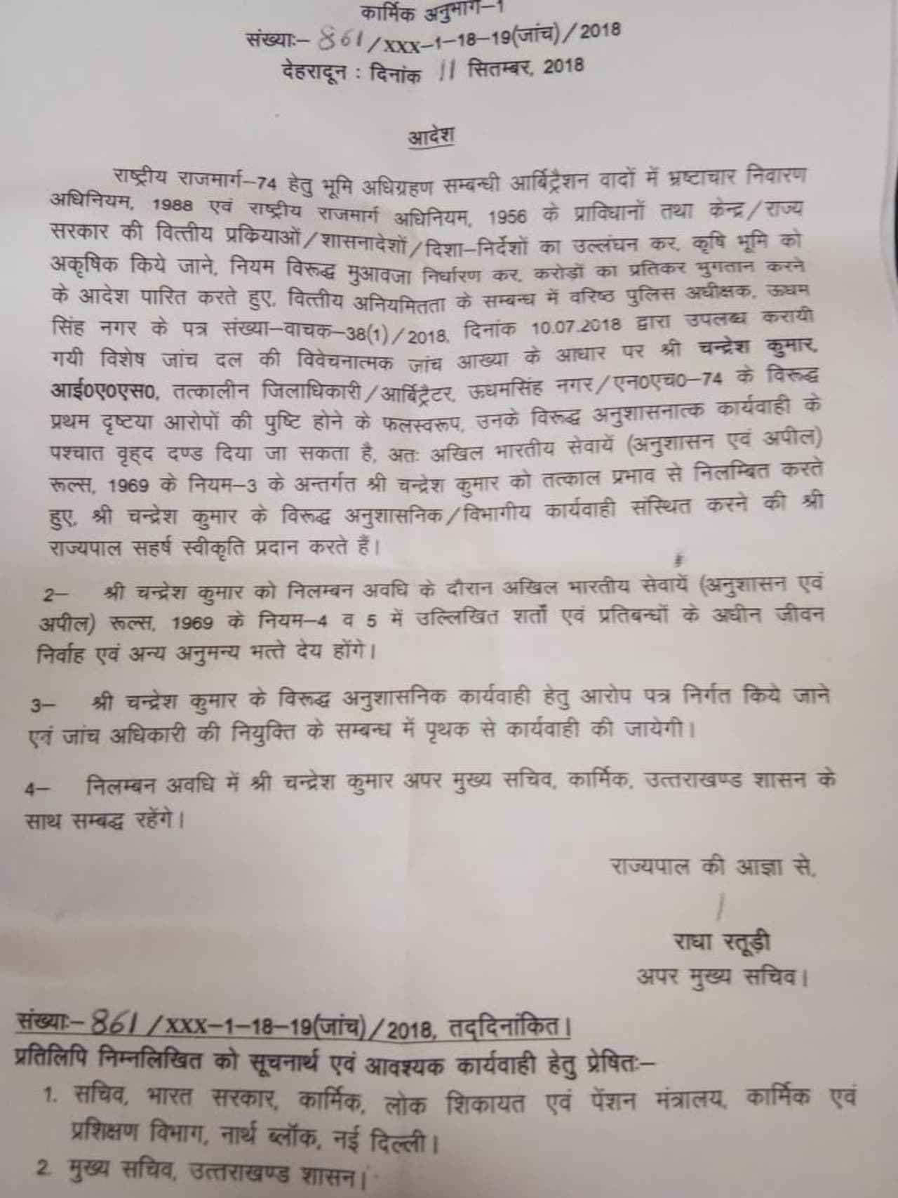 उत्तराखंड की त्रिवेन्द्र सिंह रावत सरकार ने भ्रष्टाचार के खिलाफ एक नई मिसाल कायम की है। उन्होंने दो निलंबित अधिकारियों के खिलाफ अभूतपूर्व कार्रवाई की है। जो कि भ्रष्टाचार के खिलाफ एक उदाहरण साबित होगा।