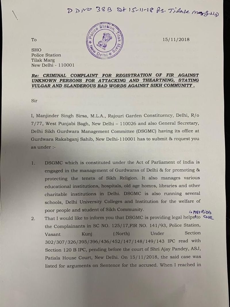 सिख नेता और राजौरी गार्डन के विधायक मनिंदरजीत सिंह सिरसा ने दिल्ली पुलिस के पास आपराधिक शिकायत दर्ज कराई है। उनका आरोप है कि कांग्रेस कार्यकर्ताओं ने गुरुवार को पटियाला हाउस कोर्ट में 1984 के नरसंहार को दोहराने की धमकी दी। अदालत ने दो लोगों को प्रधानमंत्री इंदिरा गांधी की हत्या के बाद फैले दंगों में सिखों की हत्या करने के लिए दोषी करार दिया था।