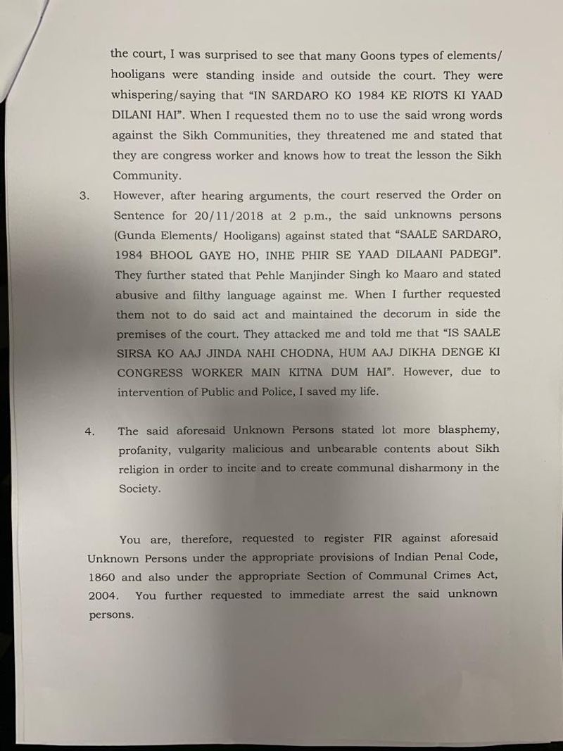 अपनी शिकायत में सिरसा ने कहा है कि अदालत परिसर के अंदर और बाहर मौजूद कांग्रेस कार्यकर्ताओं ने एक कहना शुरु कर दिया था कि " इन सरदारों को 1984 के दंगों की याद दिलानी है।"