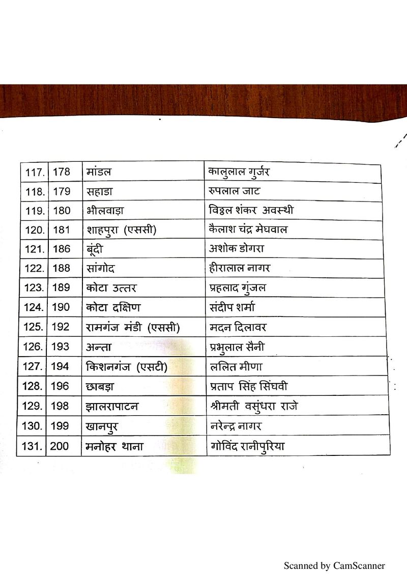 भाजपा ने राजस्थान विधानसभा की 200 में से 131 सीटों के लिए अपने उम्मीदवारों के नाम की पहली सूची जारी कर दी है। पार्टी ने इस बार 25 नए चेहरों पर दाव लगाया है। मुख्यमंत्री वसुंधरा राजे झालरापाटन की अपनी पारंपरिक सीट से ही चुनाव लड़ेंगी। पार्टी के वरिष्ठ नेता जे पी नड्डा ने भाजपा केंद्रीय चुनाव समिति के साथ बैठक के बाद नामों की घोषणा की। बैठक में प्रधानमंत्री नरेंद्र मोदी और भाजपा अध्यक्ष अमित शाह के अलावा अन्य शीर्ष नेता भी मौजूद रहे। मुख्यमंत्री वसुंधरा राजे भी बैठक में शामिल हुईं।