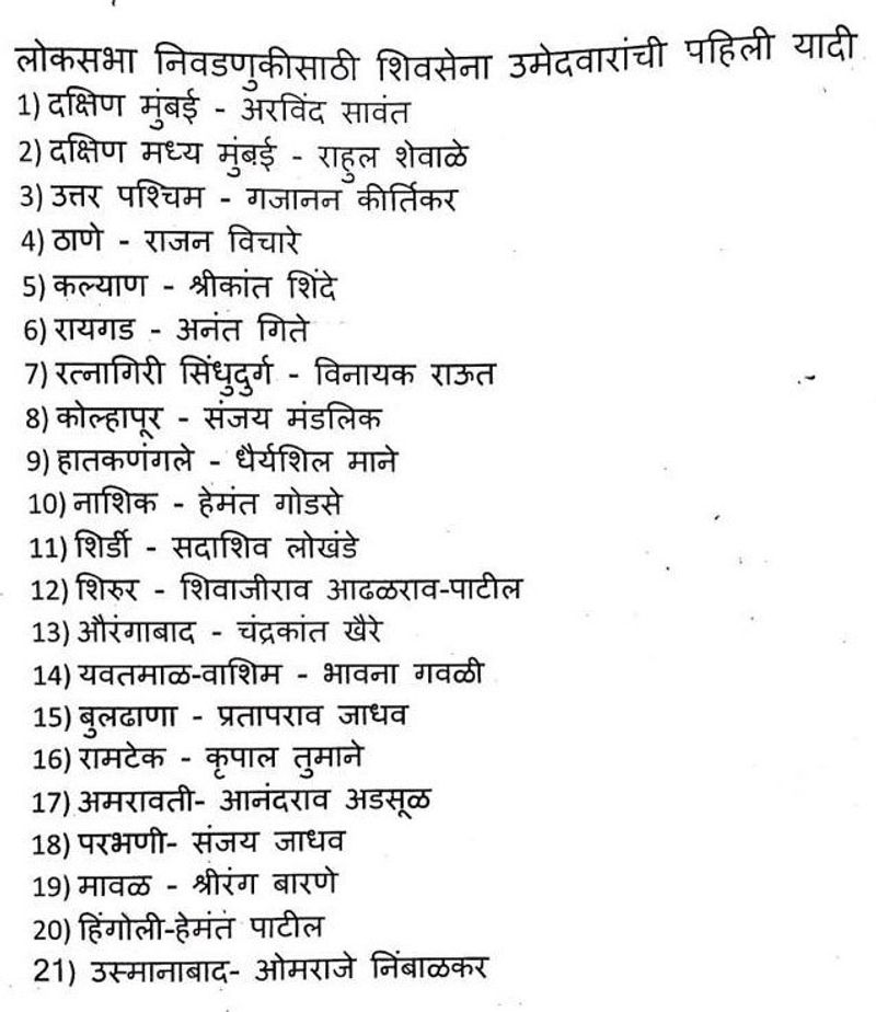 लोकसभा चुनाव के लिए एनडीए के महत्वपूर्ण घटक शिवेसना ने महाराष्ट्र में अपने उम्मीदवारों की पहली सूची जारी कर दी है। इस लिस्ट में 21 प्रत्याशियों के नाम शामिल हैं। भाजपा और शिवसेना के बीच कुछ दिनों पहले हुई कोर कमेटी की बैठक के बाद उम्मीदवारों के नाम पर अंतिम सहमति बनी। महाराष्ट्र में कुल 48 लोकसभा सीटें हैं। शिवसेना के हिस्से में 23 जबकि भाजपा के पास 25 सीटें आई हैं। राज्य में