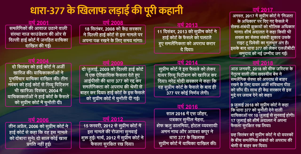 ब्रिटिश काल से चली आ रही धारा-377 आपसी सहमति से दो वयस्कों के बीच बनाए गए समलैंगिक संबंधों को आपराधिक कृत्य मानने से जुड़ी थी। चीफ जस्टिस दीपक मिश्रा, जस्टिस रोहिंटन नरीमन, एएम खानविल्कर, डी वाई चंद्रचूड़ और जस्टिस इंदु मल्होत्रा की संवैधानिक पीठ ने 10 जुलाई को मामले की सुनवाई शुरू की थी और 17 जुलाई को फैसला सुरक्षित रख लिया था।
