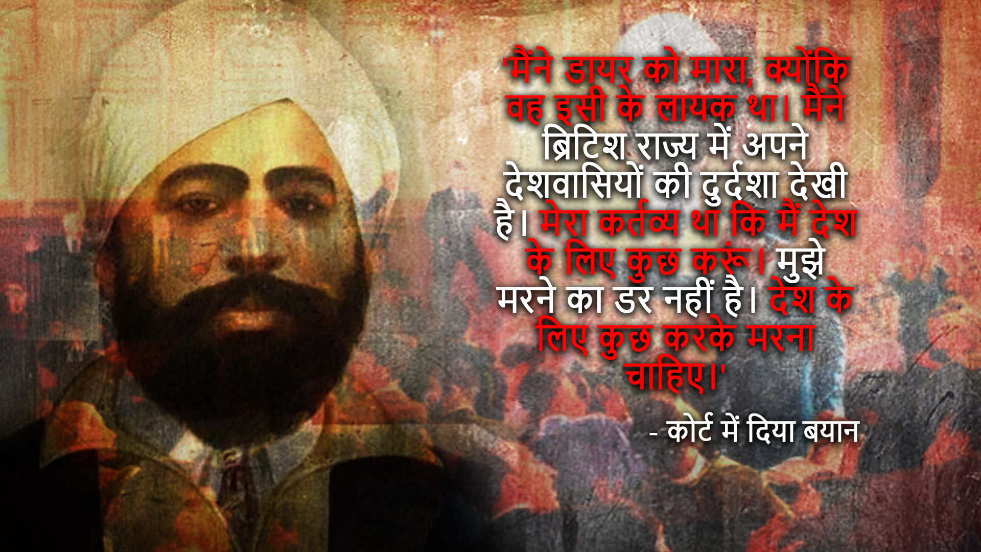 अदालत में जब उनसे सवाल किया गया कि 'वह डायर के साथियों को भी मार सकते थे, किंतु उन्होंने ऐसा क्यों नहीं किया? इस पर ऊधमसिंह ने कहा, वहां कई महिलाएं भी थीं और भारतीय संस्कृति में महिलाओं पर हमला करना पाप है। अपने बयान में ऊधमसिंह ने कहा- 'मैंने डायर को मारा, क्योंकि वह इसी के लायक था। मैंने ब्रिटिश राज्य में अपने देशवासियों की दुर्दशा देखी है। मेरा कर्तव्य था कि मैं देश के लिए कुछ करूं। मुझे मरने का डर नहीं है। देश के लिए कुछ करके जवानी में मरना चाहिए।'