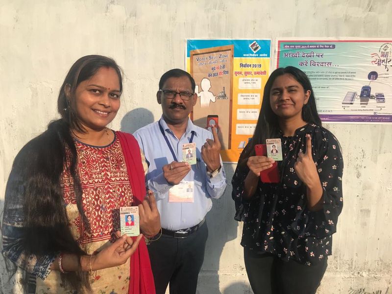 नक्सल प्रभावित दंतेवाड़ा में जिला कलेक्टर की बेटी और पत्नी वोट डालने के बाद अपना उत्साह प्रदर्शित करती हुई
