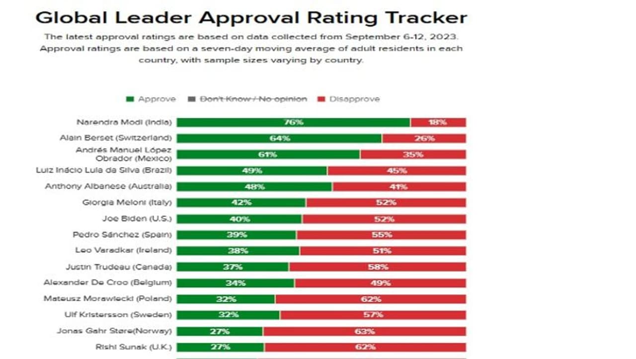 वहीं इस रेटिंग में 100 फीसदी लोगों में से 76 प्रतिशत लोगों न पीएम मोदी को दुनिया का सबसे पॉपुलर नेता माना है। जबकि 18 प्रतिशत लोगों ने इसे गलत बताया है। हालांकि इसके बाद भी पीएम मोदी 76 फीसदी रेटिंग के साथ लोगों की पहली पसंद हैं। दूसरे नंबर पर स्विट्जरलैंड के राष्ट्रपति एलेन बेर्सेट और तीसरे नंबर पर मेक्सिके राष्ट्रपति एन्ड्रेस मैनुअल लोपेज़ ओब्रेडोर हैं। चौथे नंबर पर ब्राजील के राष्ट्रपति लूला, चौथे और पांचवे नंबर पर ऑस्ट्रेलिया पीएम एंथनी एल्बोनीज और इटली की पीएम मेलोनी जॉर्जिया हैं।