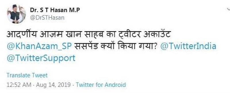 फिलहाल ट्विटर हैंडल के सस्पेंड होने के बाद भी राजनीति भी शुरू हो गई है। आजम के समर्थन में समाजवादी पार्टी के मुरादाबाद से सांसद डॉक्टर एसटी हसन ने एक ट्वीट किया है और पूछा आखिर क्यों आजम खान का ट्विटर अकाउंट सस्पेंड किया गया।