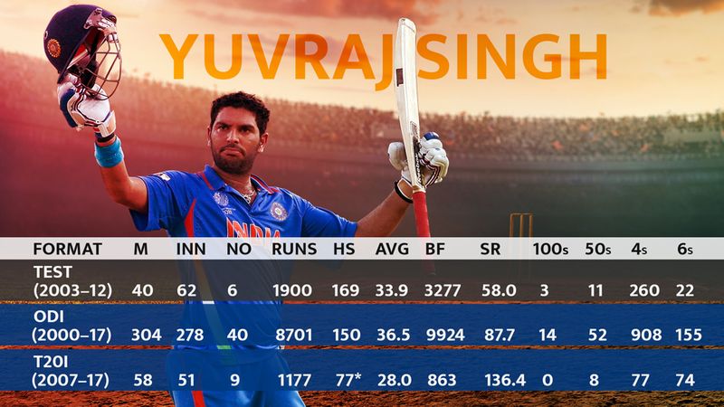 भारत के बेहतरीन ऑलराउंडरों में से एक, युवराज ने भारत के लिए 40 टेस्ट, 304 एकदिवसीय और 58 टी 20 खेले हैं । उन्होंने आखिरी एकदिवसीय मैच 2017 में खेला था, जिसके बाद चोट के चलते वो टीम से बहार हो गए।