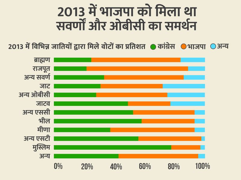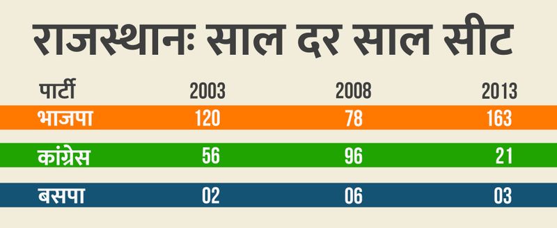 साल 2013 में हुए विधानसभा चुनाव पर नजर डालें तो भाजपा ने यहां प्रचंड जीत दर्ज की थी, जिसका असर 2014 के लोकसभा चुनाव में भी दिखा था। 2014 के लोकसभा चुनाव में राज्य में भाजपा ने सभी 25 सीटें जीत ली थीं। राजस्थान में विधानसभा की कुल 200 सीटे हैं। यहां सरकार बनाने के लिए किसी भी पार्टी के पास 101 विधायकों को समर्थन चाहिए। यहां की 200 विधानसभा सीटों में से 142 सामान्य हैं, इसके अलावा अनुसुचित जाति के लिए 33 और जनजाति के लिए 25 सीटें आरक्षित हैं। पिछले विधानसभा चुनाव में भाजपा ने 163 सीटें जीती थीं। कांग्रेस के खाते में 21 और बसपा के खाते में तीन सीटें गई थीं। भाजपा को 45.50 फीसदी, कांग्रेस को 33.31 और बसपा को 3.48 फीसदी वोट मिले थे। इस चुनाव में कुल 25 महिलाएं निर्वाचित हुई थी इसमें से 19 भाजपा की थी।