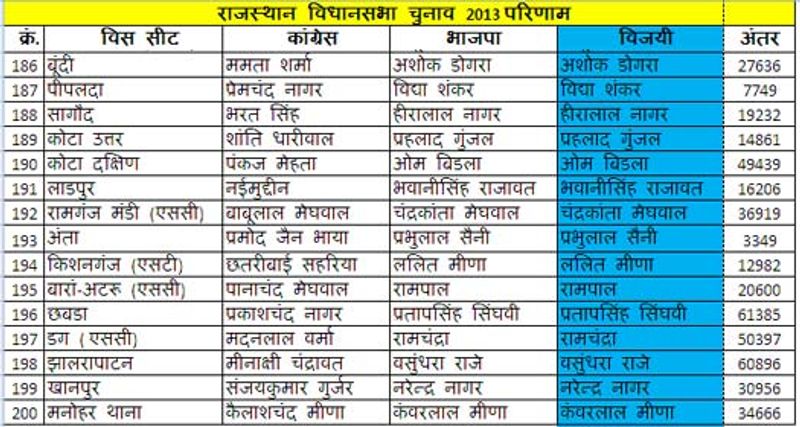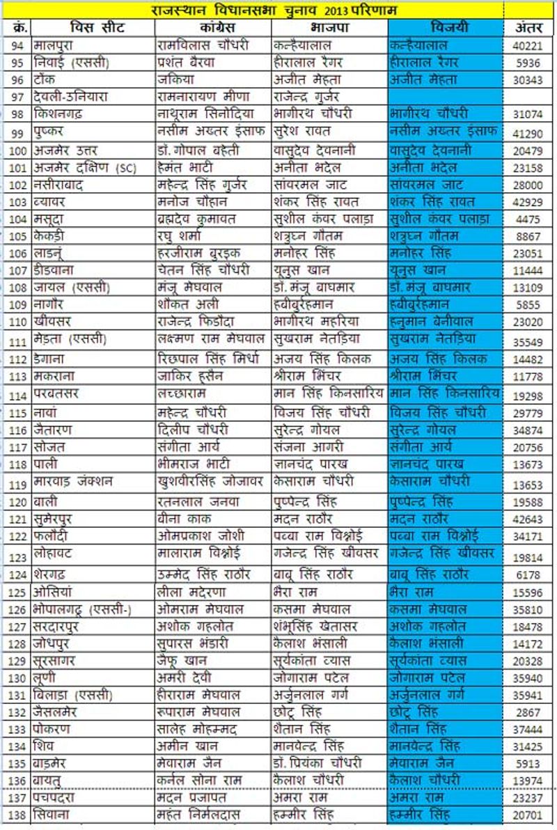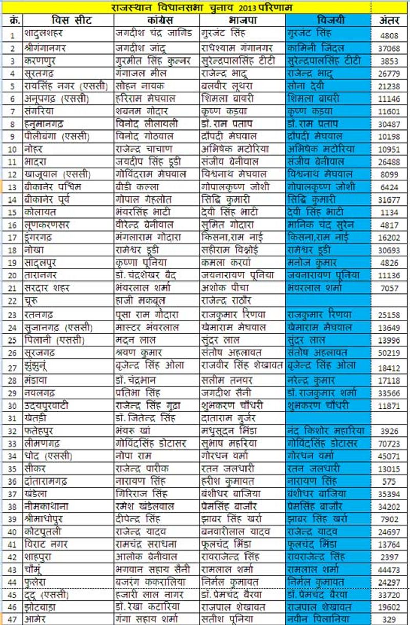 साल 2013 में हुए विधानसभा चुनाव पर नजर डालें तो भाजपा ने यहां प्रचंड जीत दर्ज की थी, जिसका असर 2014 के लोकसभा चुनाव में भी दिखा था। 2013 के विधानसभा में जहां भाजपा ने 163 सीटें जीती थीं वहीं 2014 के लोकसभा चुनाव में सभी 25 सीटें अपने नाम की थीं। कांग्रेस के 21 और बहुजन समाज पार्टी के 3 प्रत्याशी विधायक बने थे। राजस्थान में विधानसभा की कुल 200 सीटें हैं। यहां सरकार बनाने के लिए किसी भी पार्टी के पास 101 विधायकों को समर्थन चाहिए। यहां की 200 विधानसभा सीटों में से 142 सामान्य हैं। इसके अलावा अनुसुचित जाति के लिए 33 और जनजाति के लिए 25 सीटें आरक्षित हैं।