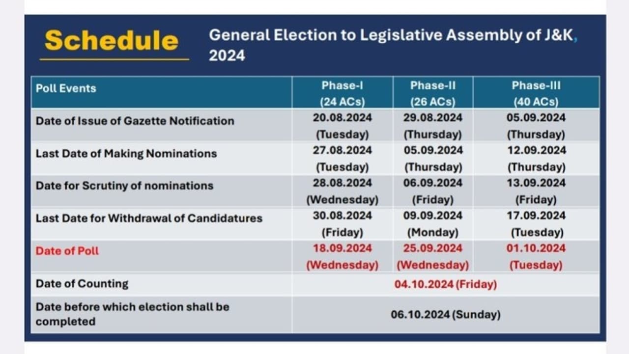 जम्मू-कश्मीर में तीन चरणों में मतदान होगा। पहला चरण 18 सितंबर, दूसरा चरण 25 सितंबर और तीसरा चरण 1 अक्टूबर को होगा। कुल 90 विधानसभा निर्वाचन क्षेत्रों में से 24 पर पहले चरण में 24, दूसरे चरण में 26 और तीसरे चरण में 40 सीटों पर मतदान होगा। नतीजे 4 अक्टूबर 2024 को घोषित किए जाएंगे। इस चुनाव के खास महत्व का एक कारण यह भी है कि यह अनुच्छेद 370 हटने के बाद जम्मू-कश्मीर में पहला चुनाव होगा। पिछले विधानसभा चुनाव 2014 में हुए थे। इसके बाद से राज्य में कोई निर्वाचित सरकार नहीं है।