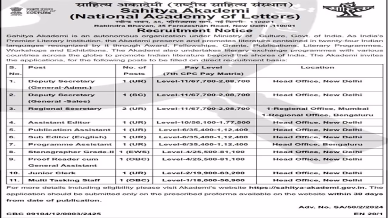 साहित्य अकादमी में निकली वैकेंसी का डिटेल