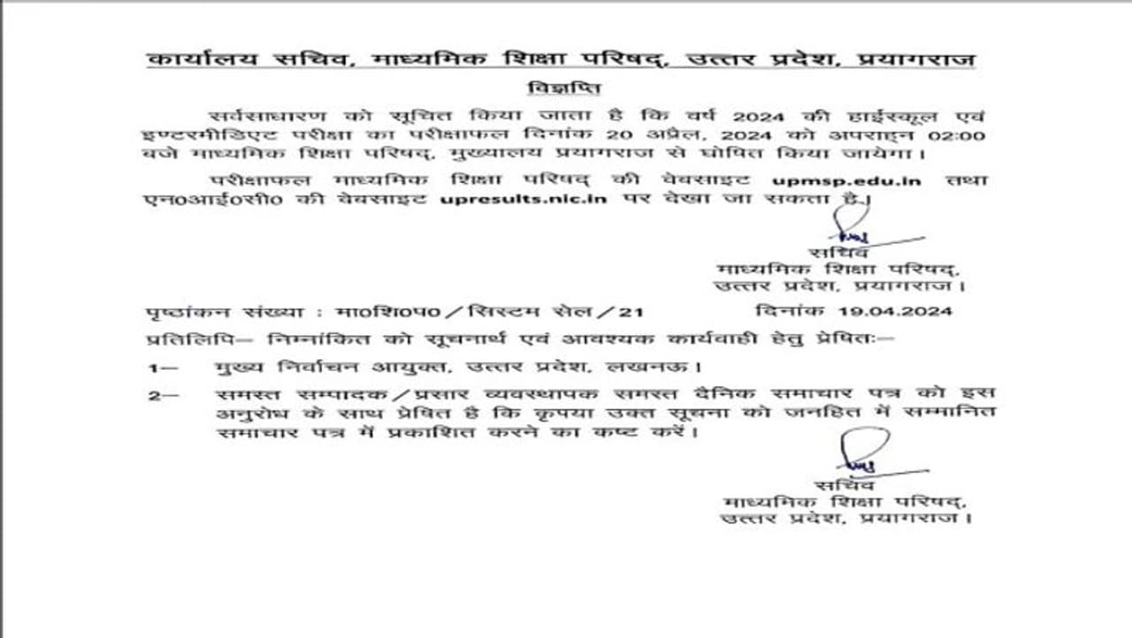 UPMSP UP Board Class 10th Result 2024: यूपी बोर्ड के अध्यक्ष आज दोपहर 02 बजे यूपी बोर्ड कक्षा 10वीं और 12 वीं का रिजल्ट जारी करेंगे। यूपी बोर्ड उत्तर प्रदेश माध्यमिक शिक्षा परिषद 10वीं और 12वीं की परीक्षा 2024 ( UPMSP UP Board exam ) 22 फरवरी 2024 से 9 मार्च 2024 तक आयोजित हुई। अब यूपी बोर्ड परीक्षा की उत्तर पुस्तिकाओं को 10 अप्रैल को चेक कर लिया गया था। उसके बाद से ही ये चर्चा थी कि यूपी बाेर्ड 25 अप्रैल तक में कभी भी रिजल्ट घोषित कर सकता है। उसके बाद 19 अप्रैल को बोर्ड के सचिव दिव्यकांत शुक्ल ने प्रेस रिलीज जारी करके बताया कि 20 अप्रैल को रिजल्ट घोषित किए जाएंगे।