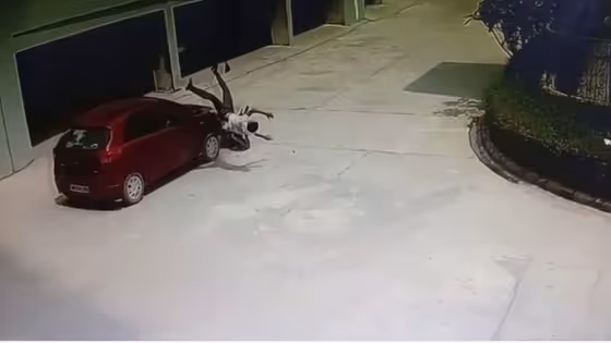 यूपी के ग्रेटर नोएडा के गैलेक्सी वेगा अपार्टमेंट के सामने एक बाइक सवार उस समय बाल-बाल बच गया जब वह पार्किंग के सामने एक कार से जा टकराया। यह पूरी घटना वहां लगे सीसीटीवी में कैद हुई है। इसमें साफ दिख रहा है कि बाइक सवार पार्किंग से बाहर निकलते ही कार से टकरा गया। टक्कर इतनी तेज थी कि वह उछलता हुआ दूर जाकर गिरा। गनीमत रही कि उसे इतनी जोरदार टक्कर के बावजूद मामूली चोट ही आई।