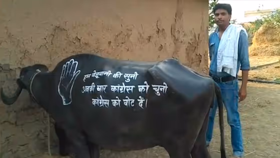छत्तीसगढ़ में भैंस भी चुनावी समर में उतर कांग्रेस पार्टी के लिए वोट मांगती दिख रही है। जी हां कवर्धा जिले के पंडरिया इलाके में युवा कांग्रेसी नेताओं ने चुनावी प्रचार के लिए भैंस को भी नही छोड़ा। भैंस पर कांग्रेस के पक्ष में वोट देने के नारे लिख दिए गए हैं ।