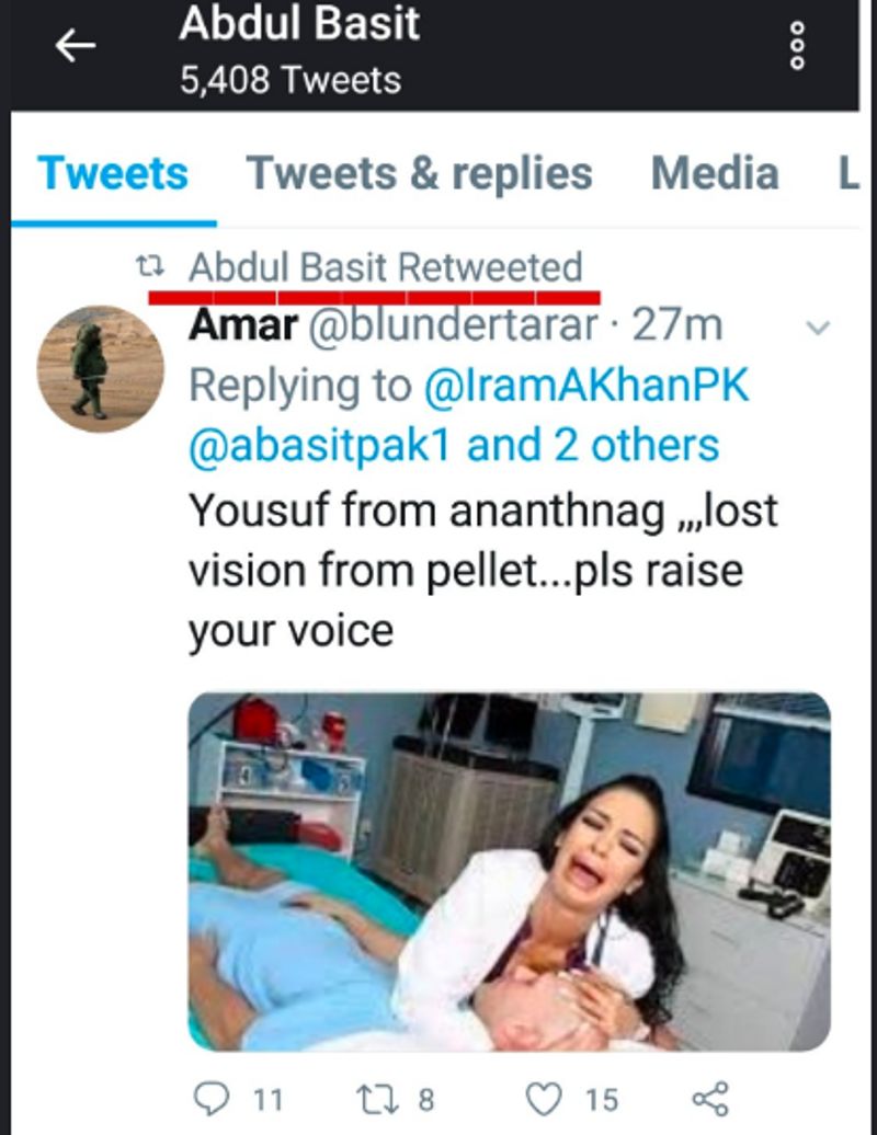 बासित ने पोर्न स्टार जॉनी सिन्स की एक फोटो शेयर कर उन्हें भारतीय सेना की पिटाई का शिकार हुआ जम्मू कश्मीर के अनंतनाग का रहने वाला युसूफ बताया था। जिसके बाद से अब्दुल बासित दुनिया भर में ट्रोल हो रहे हैं।