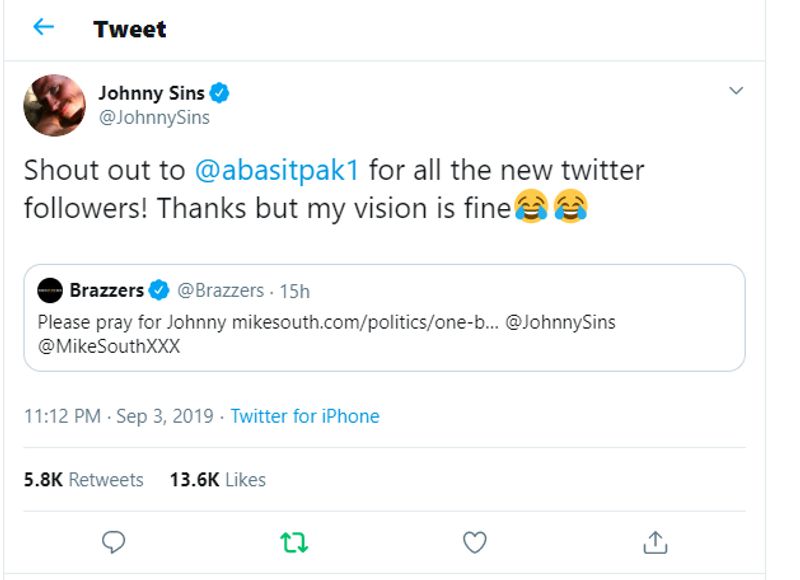 पाकिस्तानी राजनेता अब्दुल बासित का मजाक उड़ाते हुए पोर्न स्टार जॉनी सिन्स ने ट्वीट पर कहा कि मैं आपको धन्यवाद देता हूं कि आपके चलते मेरे फॉलोअर्स बढ़ गए हैं। मेरी नजर बिल्कुल ठीक है और मुझे दुनिया भर में फेमस करने के लिए आपका धन्यवाद।